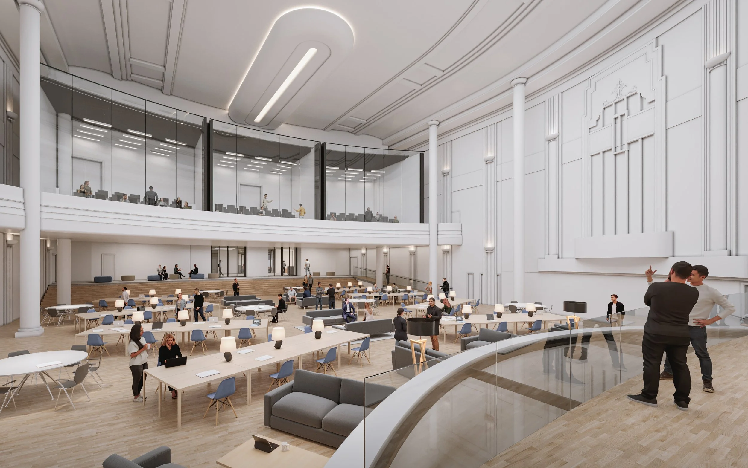 The proposal is to use the space of the auditorium as co-working use. At the ground floor of the theatre hall, the stalls and stage will be furnished with flexible seating and workstations. The internal walls and ceiling of the auditorium will be restored and preserved to give the space its unique character.