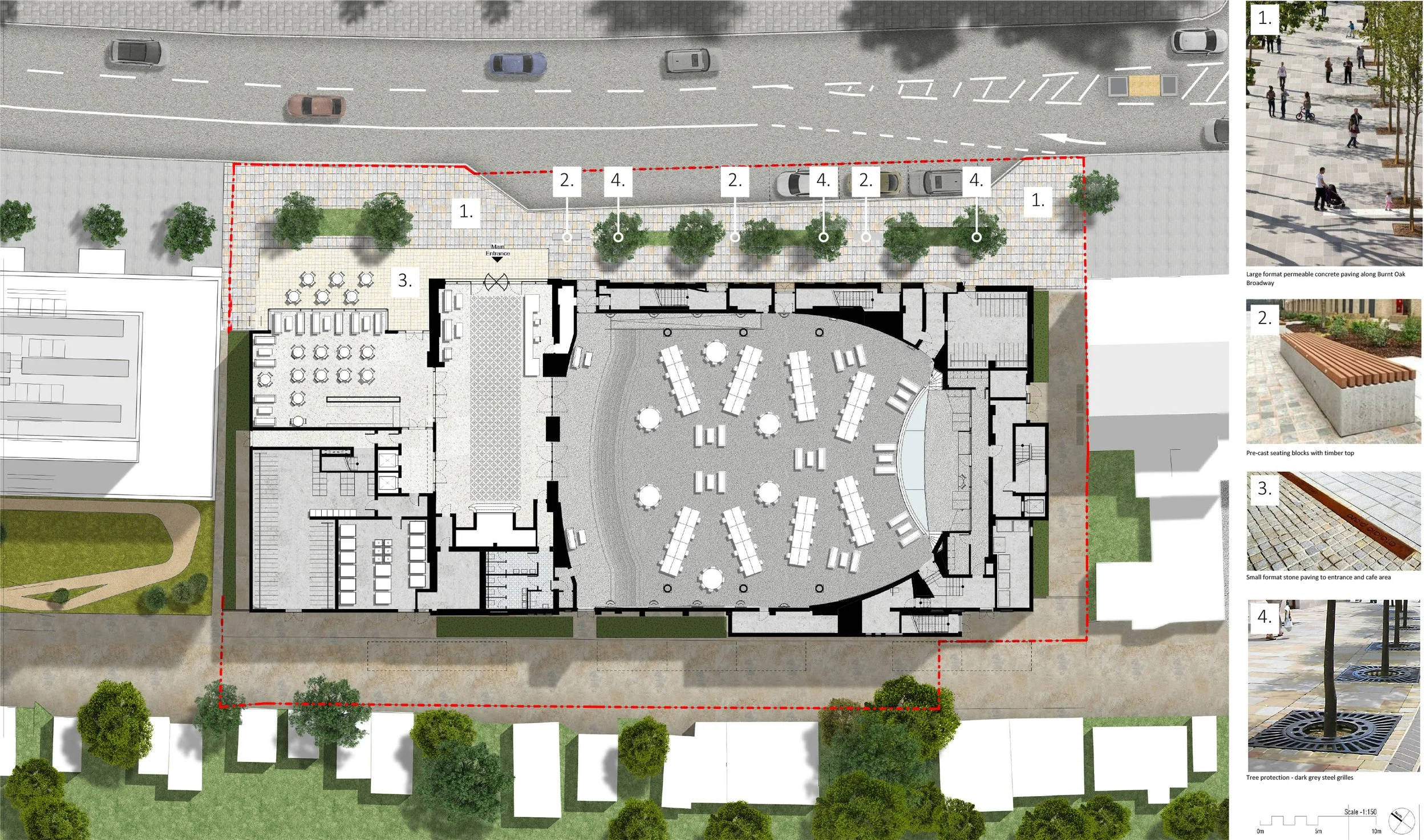 The paving is proposed to be replaced by high quality permeable concrete paving. The six trees in front of the building will be contained in dark grey metal tree grilles, with two new trees to be planted in front of the Café. The existing facade will be cleaned but remain inactive.